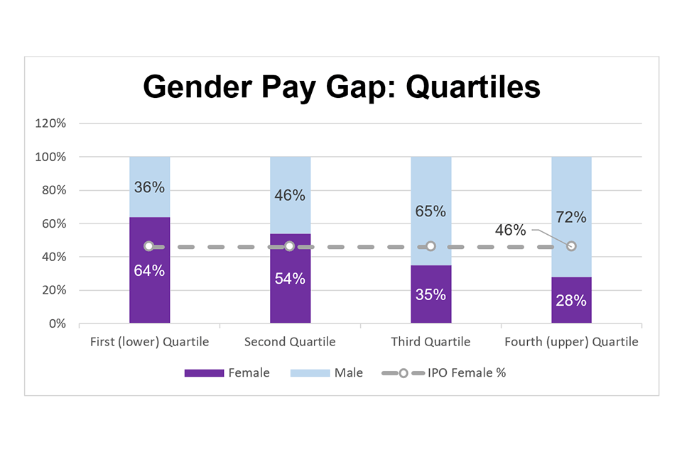 Women make up 64% of the lower quartile and 28% of the upper quartile. The IPO has 46% women overall, the above table shows that the pay gap is due to there being more women in lower grades.
