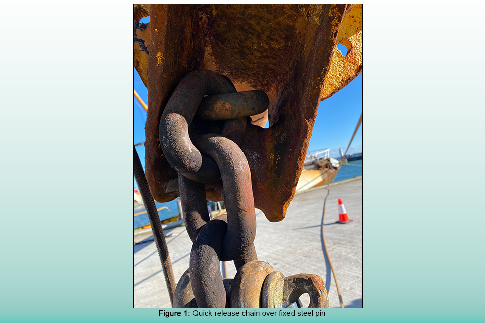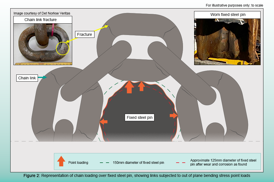 The side loading of individual chain links on Cornishman resulted in out of plane stresses, which the chain was not designed to withstand. This caused heavy wear on the fixed pin and chain links as the links were operating under dynamic loads. Alternative quick-release designs are available and should be considered as a safety improvement to minimise the opportunity for sudden failure. A safety bulletin, issued by MAIB in February 2024, provides more details.