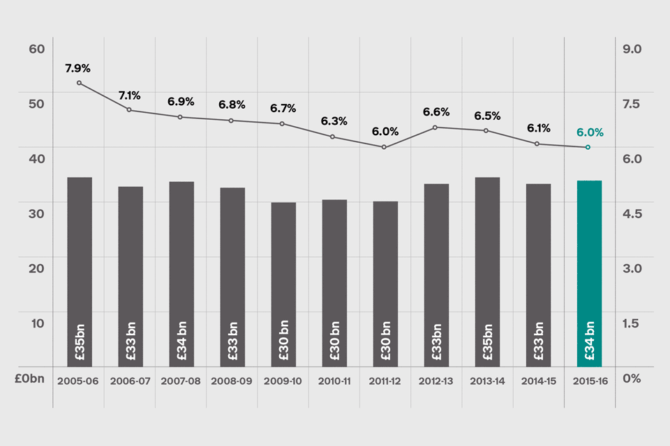 We estimate the 2015 to 2016 tax gap was 6% of total tax and duties due to HMRC (£34 billion) – a fall from 6.1% in 2014 to 2015. The tax gap has reduced from 7.9% in 2005 to 2006 when we first started measuring it.