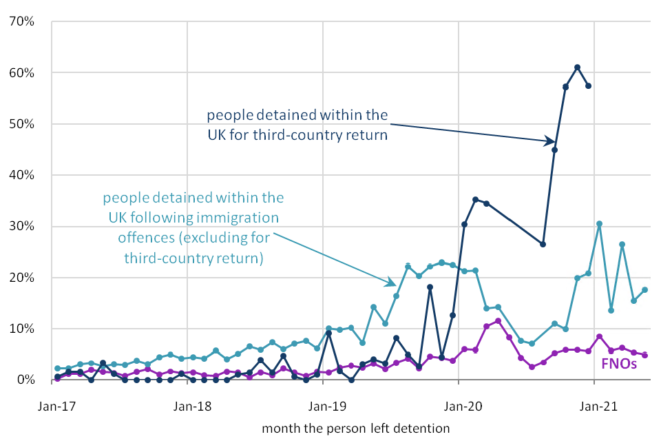 A line chart showing that towards the end of 2020 around 60% of people who were detained in the UK for third-country return were referred to the NRM.