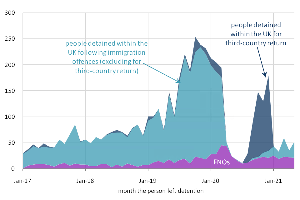 Numbers were lower for FNOs in detention, but also rose from 79 (1% of detentions) to 182 (3% of detentions). Numbers reduced slightly in early 2020 as the number of people in detention fell, but then dropped sharply in April 2020 as the UK entered lockdown and relatively few people were detained.