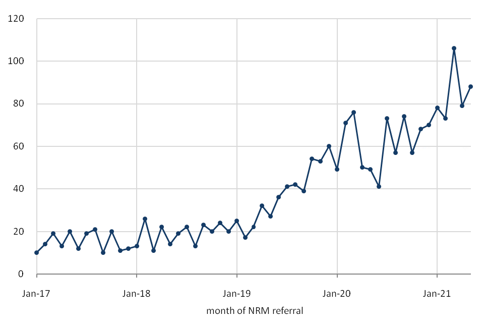Referrals of FNOs to the NRM (including from foreign nationals held on remand) increased in early 2019 and generally continued to rise since then. Referrals averaged 19 per month in 2018, 37 per month in 2019, 61 per month in 2020, and 85 per month in the first five months of 2021.