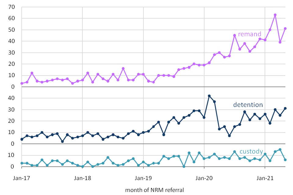 Three line charts showing the number of referrals from people on remand, in detention, and in custody. Referrals from people on remand have been rising since early 2019 and are now the largest contributor in 2021.