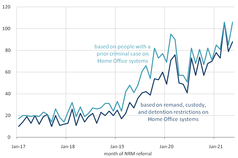 The Home Office analysis published in March 2021 showed that NRM referrals had risen sharply from 2018 to 2019, with the number of referrals from people detained following immigration offences rising from 718 (5% of detentions) to 1,767 (16% of detentions).