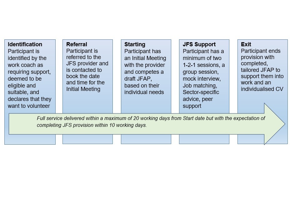 Full service delivered within a maximum of 20 working days from Start date, but with the expectation of completing JFS provision within 10 working days.