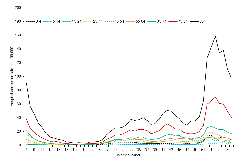 Figure 1: weekly hospital admission rate by age group for new COVID-19 positive cases reported through SARI Watch