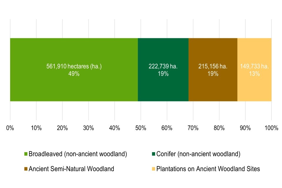 - plantations on ancient woodland sites (149,733ha, 13%)