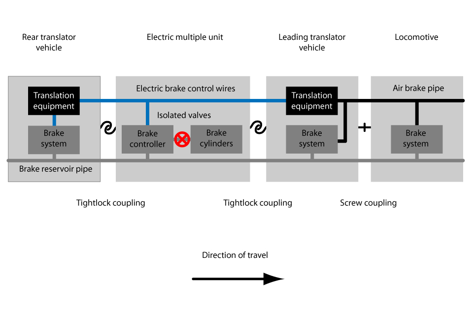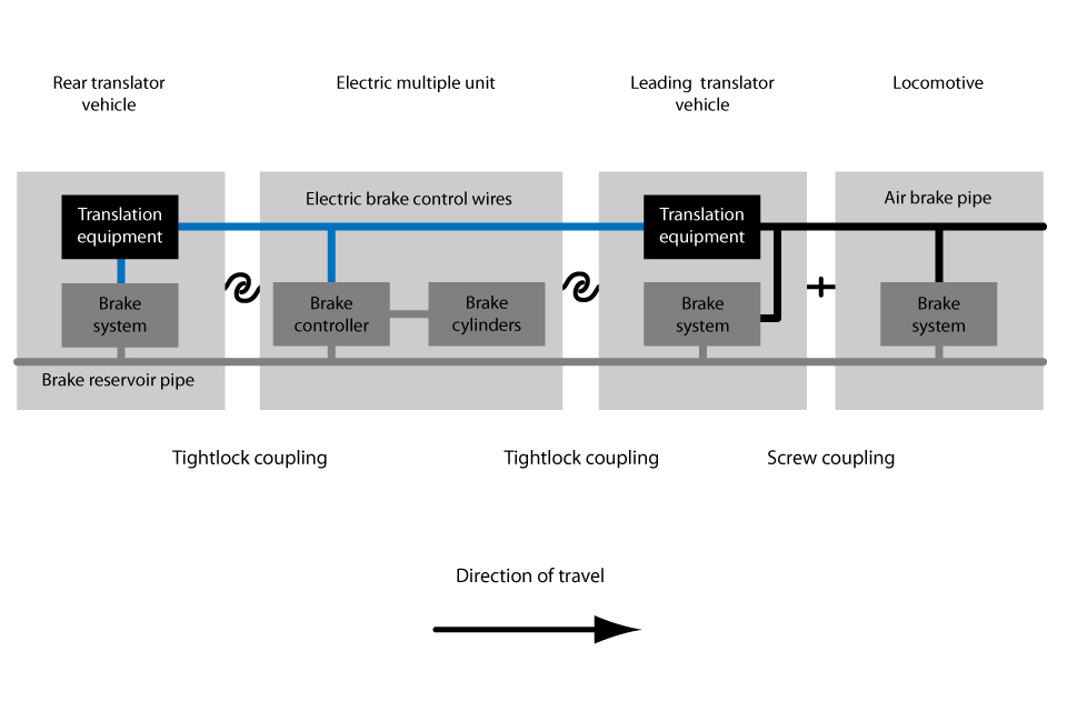 In normal operation, the driver controls the pressure in the air brake pipe in the locomotive, which indirectly operates the brakes on the locomotive and on the lead translator vehicle. The lead translator vehicle converts the pressure in the air brake pipe to electrical signals which are sent to the EMU and on to the rear translator vehicle. These signals then control the brake systems on the EMU and on the rear translator vehicle.