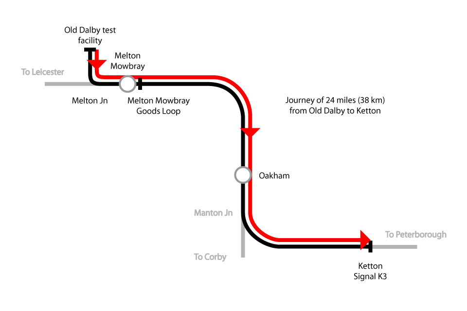 Simplified map showing route the train took from the Old Dalby test facility through Melton Mowbray and Oakham before approaching signal K3 at Ketton (not to scale)