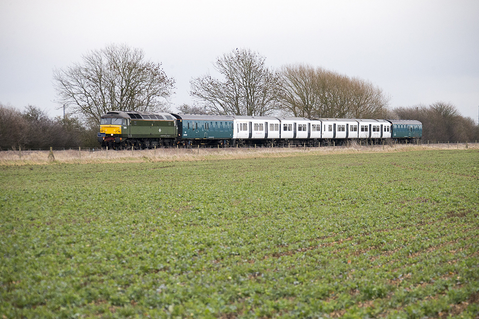 The EMU was being hauled, unpowered, back to Ilford depot, in East London, following refurbishment work at the Old Dalby test facility, near Melton Mowbray. The train was formed with a translator vehicle coupled to each end of the EMU and the locomotive at the front.