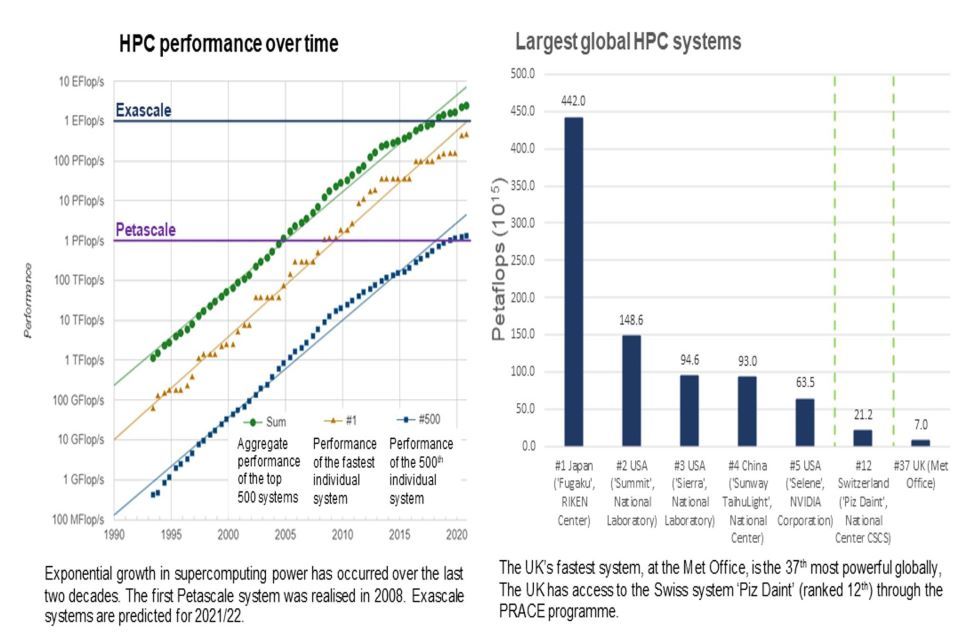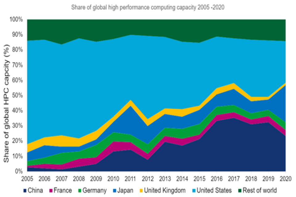 The UK is a global leader in a number of computing domains, including in areas of software development, computational modelling, data analytics, cybersecurity, AI and machine learning. [footnote 1], [footnote 2] However, the UK’s large-scale computing infrastructure lags behind other major global economies and would benefit from a refreshed, longer term focus that takes into account interdependencies such as skills and software. As of November 2020, China and the US had 214 and 113 of the top 500 computer systems globally, and France and Germany had 18 and 17. In contrast, the UK had 12. [footnote 3]. The UK’s share of global high-performance computing capacity has decreased by three-fifths over five years, falling to 2.0% in 2019. [footnote 4]