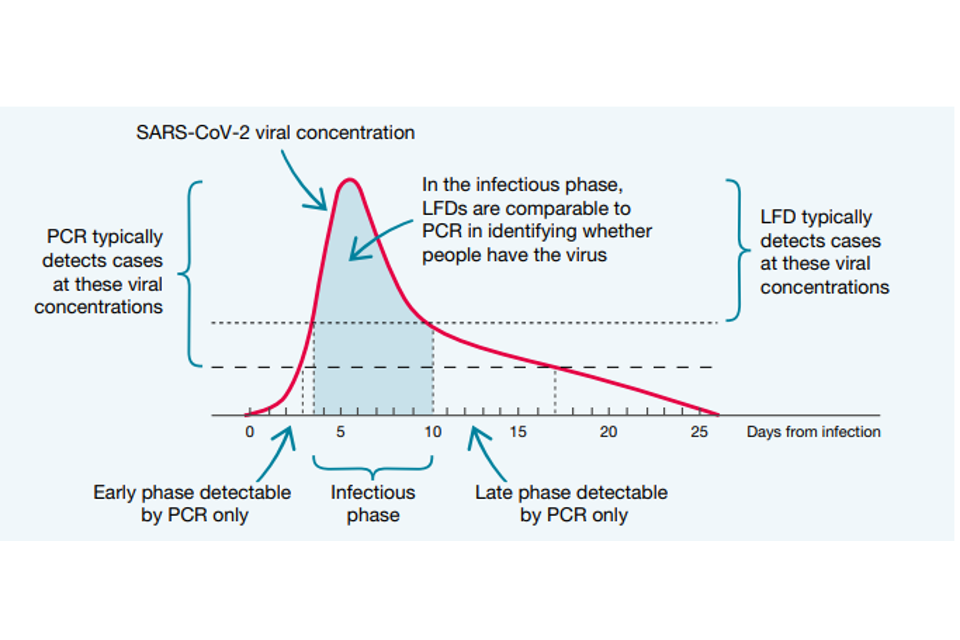 PCR detects the presence of ribonucleic acid (RNA), the genetic material of the virus. LFDs detect the presence of an antigen (a type of protein) produced by the SARS-CoV-2 virus when it is active. PCR testing detects all RNA, even small fragments, but the virus is only infectious when the RNA is intact. The task for LFDs wasn’t to diagnose whether the individual had the infection, but whether they were infectious – would this person infect others?