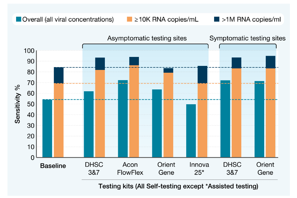 For LFDs to be useful in stopping the spread of infection, what was important was how they performed in identifying those with medium and high viral concentrations, because studies have shown that more than 4 out of 5 who caught the virus were infected by someone with a viral concentration greater than 10,000 RNA copies/ml.