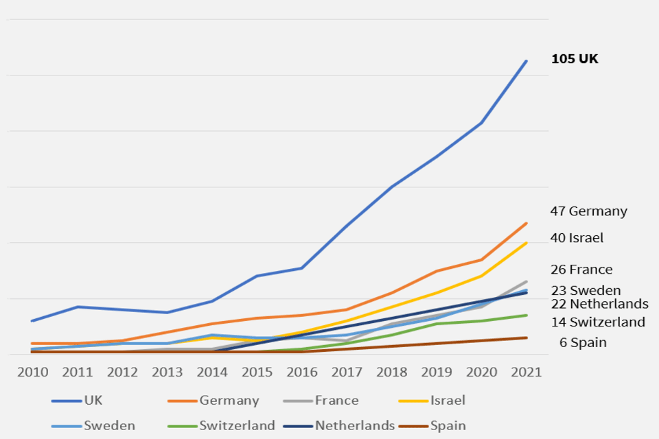 In 2021 the UK became the third country in the world to pass 100 unicorns, after the US and China. The UK now has more unicorns than Germany, France and Sweden combined. The UK is also home to 153 potential future unicorns, valued over $250 million.