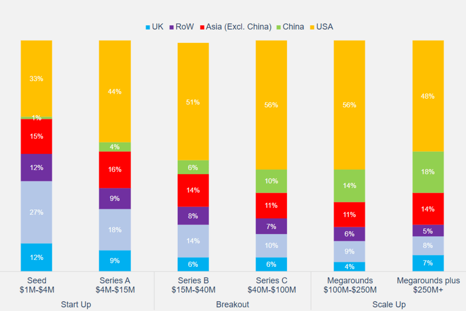 Figure 4: Percentage of global investment in 2020 to 2021 year to date by region per round size