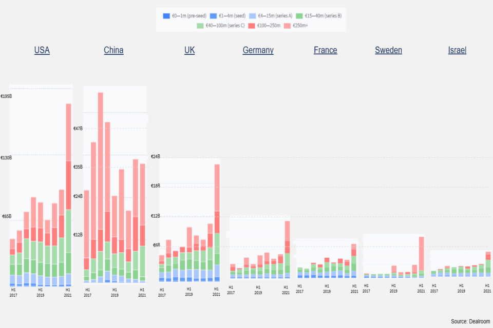 Despite being third in the world for VC investment, the UK is proportionately weak at scale up (over €100 million), particularly in comparison to the USA and China