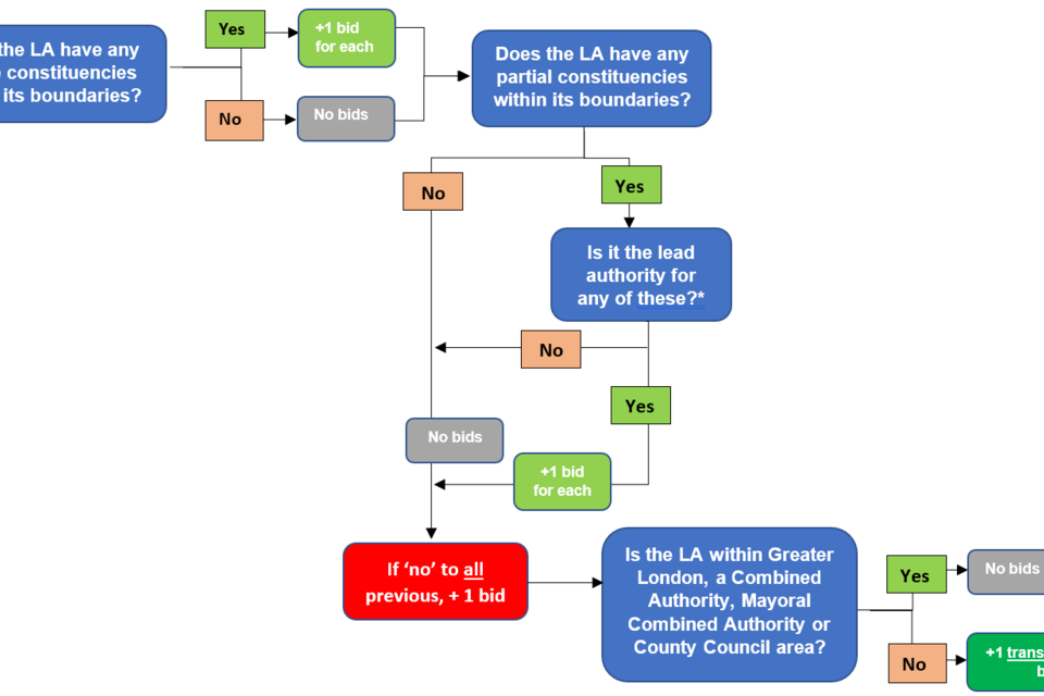 Where an MP’s constituency crosses multiple local authorities, one local authority should take responsibility as the lead bidder and local areas should work together to designate that lead bidder. Annex A sets out how local authorities of all types in Great Britain can work out the number of bids they are eligible to submit.