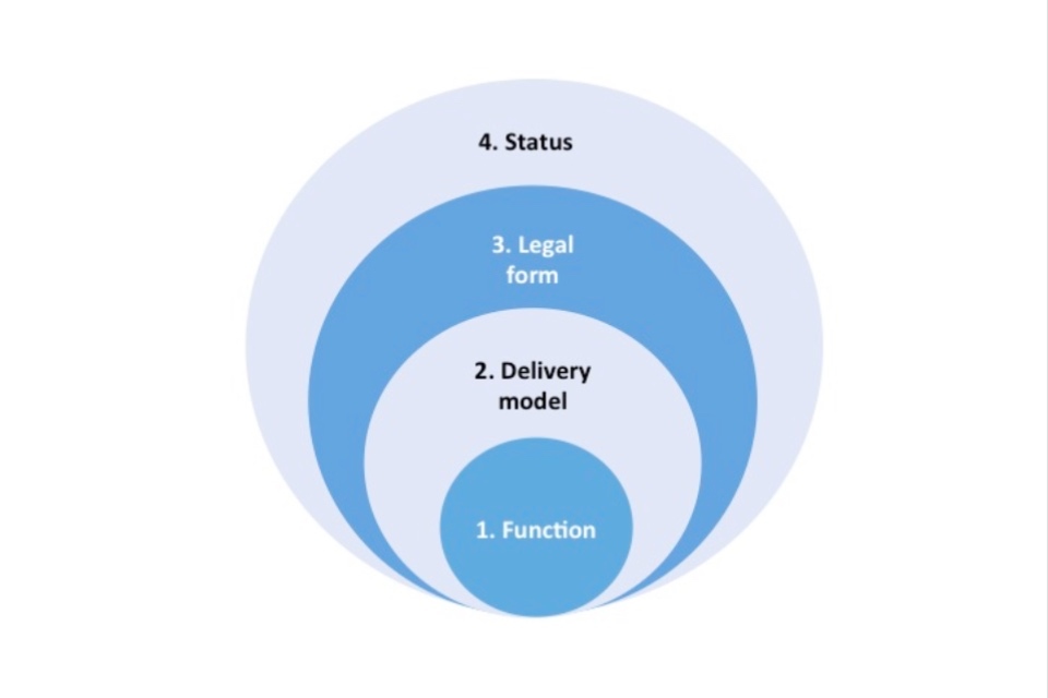 Diagram of larger circles inside each other showing the thought process for deciding on your legal form and status. The first step is looking at function, then the delivery model, legal form and status.