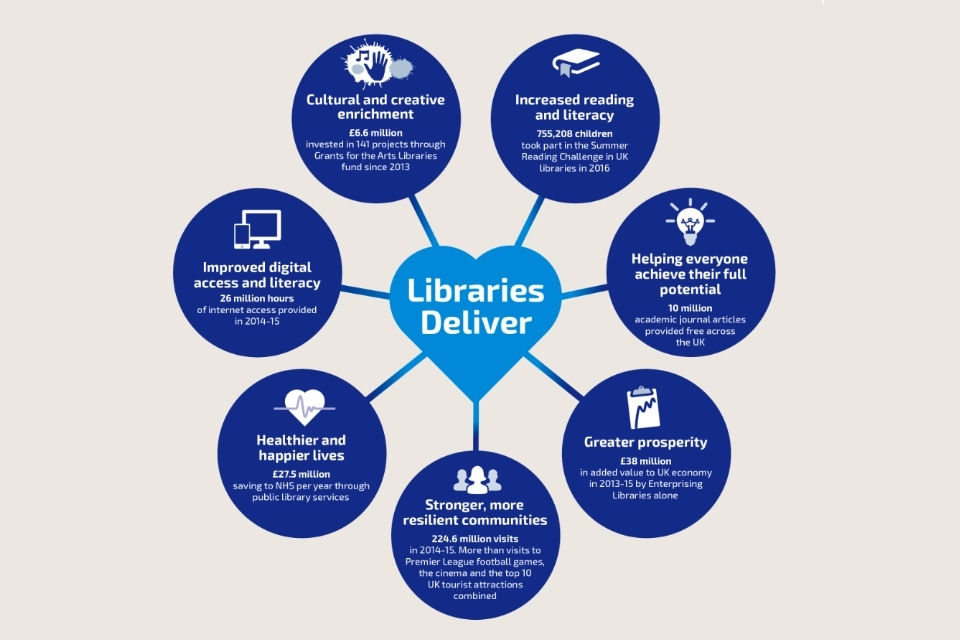 - Healthier and happier lives: £27.5 million saving to NHS through public library services. Source: Arts Council England