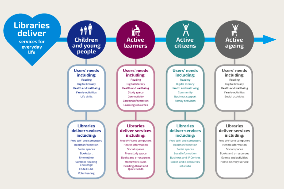 Diagram that illustrates how libraries are for everyone, throughout their life. These include children and young people, active learners, active citizens and active ageing.