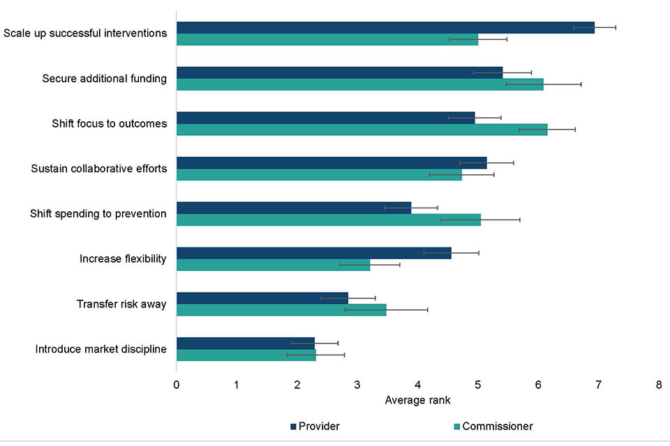 All respondents were asked to rank their priorities in terms of what they hoped to accomplish by using a SIB, from 1 (lowest) to 8 (highest). Sample comprises providers (n=72) and commissioners (n=48). Error bars are 95% confidence intervals. ↩