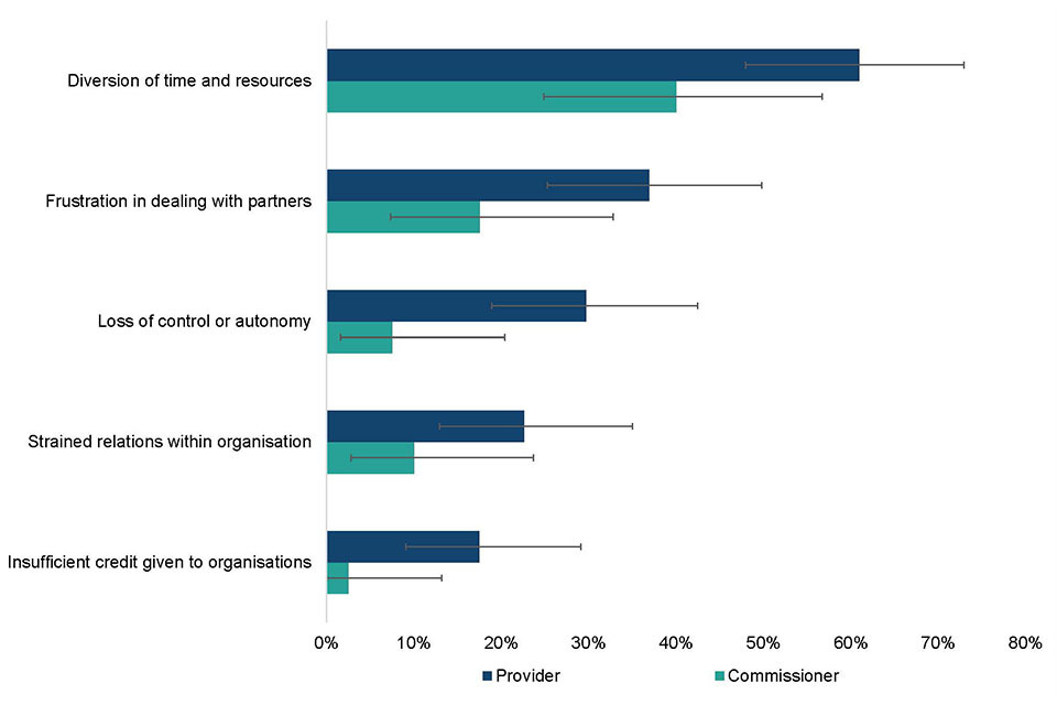 The main drawback occurring during implementation is diversion of time and resources (Figure 7), which was reported across all organisation types and roles. In particular, providers reported that a larger number of drawbacks had already occurred compared to commissioners from local government (Figure 8). [footnote 8] This may stem from the technical complexity and increased reporting and monitoring requirements associated with SIBs.