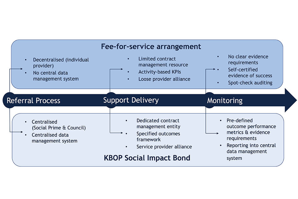 - While the previous model allowed for limited flexibility or personalised support in service provision, the KBOP SIB’s outcomes contract and provider contracts have light-touch specifications.