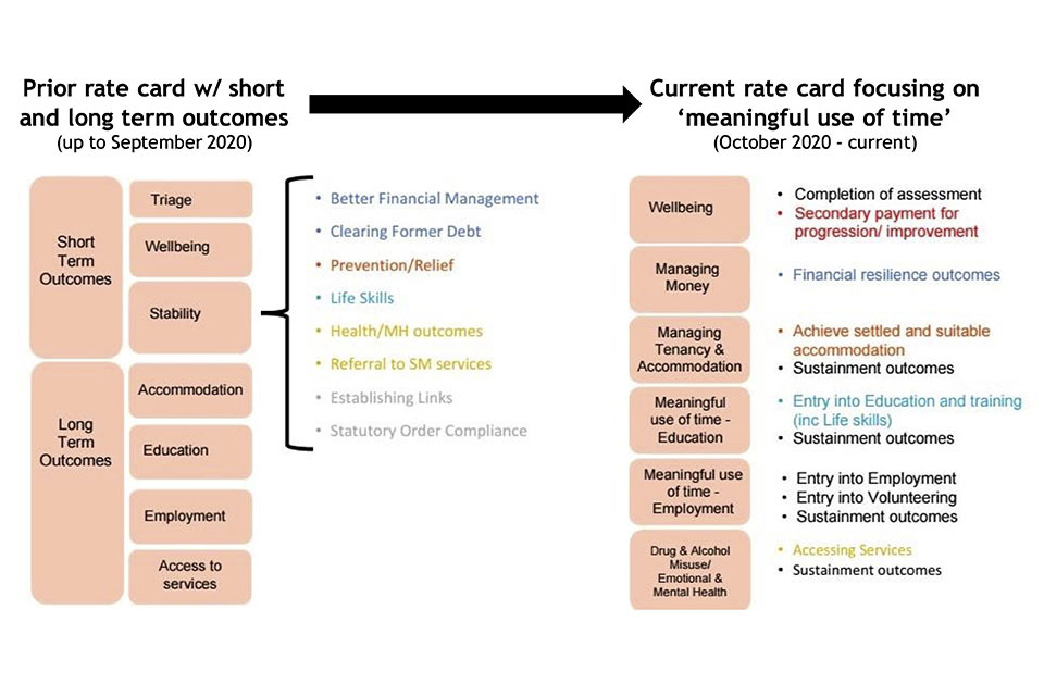 The colour coding illustrates how outcome measures have evolved between the first and second iteration of the rate card. ↩