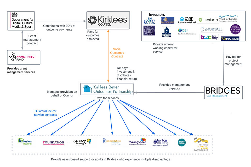 In the KBOP SIB, payment is based on achieved outcomes (defined in a pre-agreed rate card). Service delivery is managed by an investor-owned social prime contractor. Kirklees Council holds the social outcomes contract with the social prime. The social prime holds bi-lateral fee-for-service contracts with eight social sector providers.