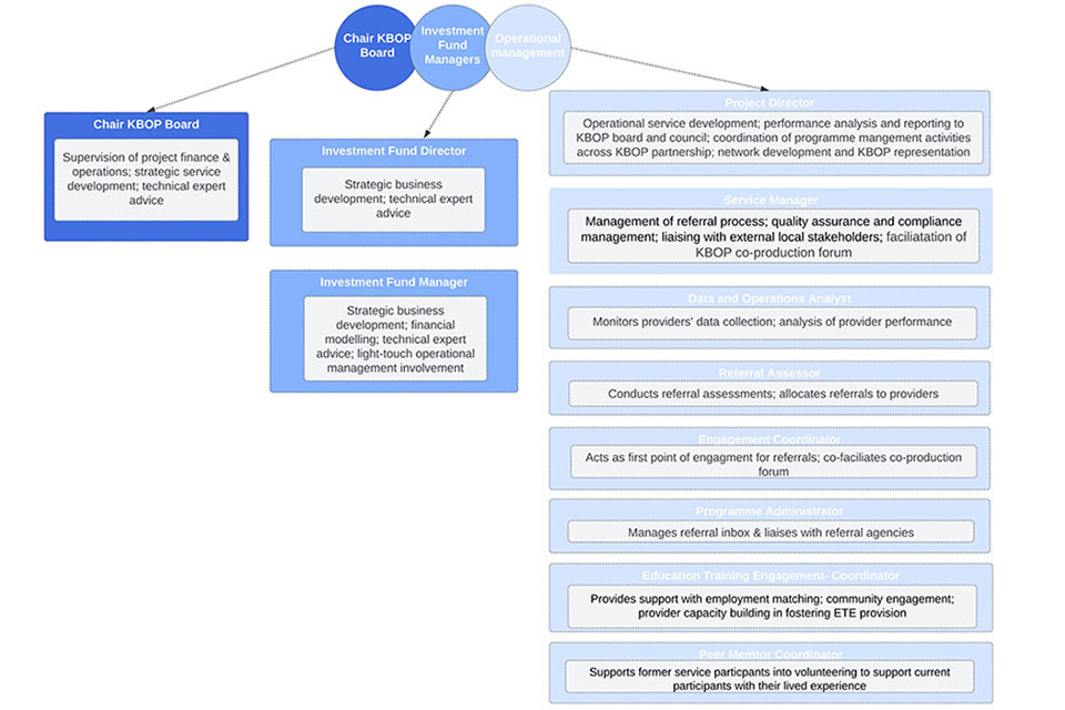 - The KBOP project director led in building cross-sector collaboration, which extends beyond the immediate KBOP delivery network to overcome siloed working and service fragmentation. For example, the KBOP director jointly developed a pilot between the council and justice system to improve support to ex-offenders in accessing accommodation.