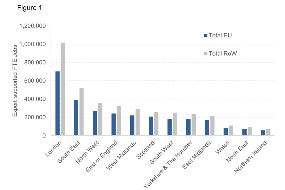 1.6 UK jobs are particularly dependent on non-EU exports across all areas of the country. Exports to the EU and the Rest of the World supported around 2.8 million and 3.7 million UK FTE jobs in 2016, respectively.[footnote 10] Over the same period, by individual export destination, exports to the United States supported the largest number of jobs; around 1.3 million UK direct and indirect jobs (or 4% of all UK FTE jobs).