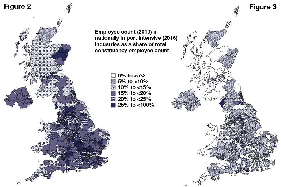 Figures 2 and 3: employee count (2019) in nationally import intensive (2016) industries as a share of total constituency employee count
