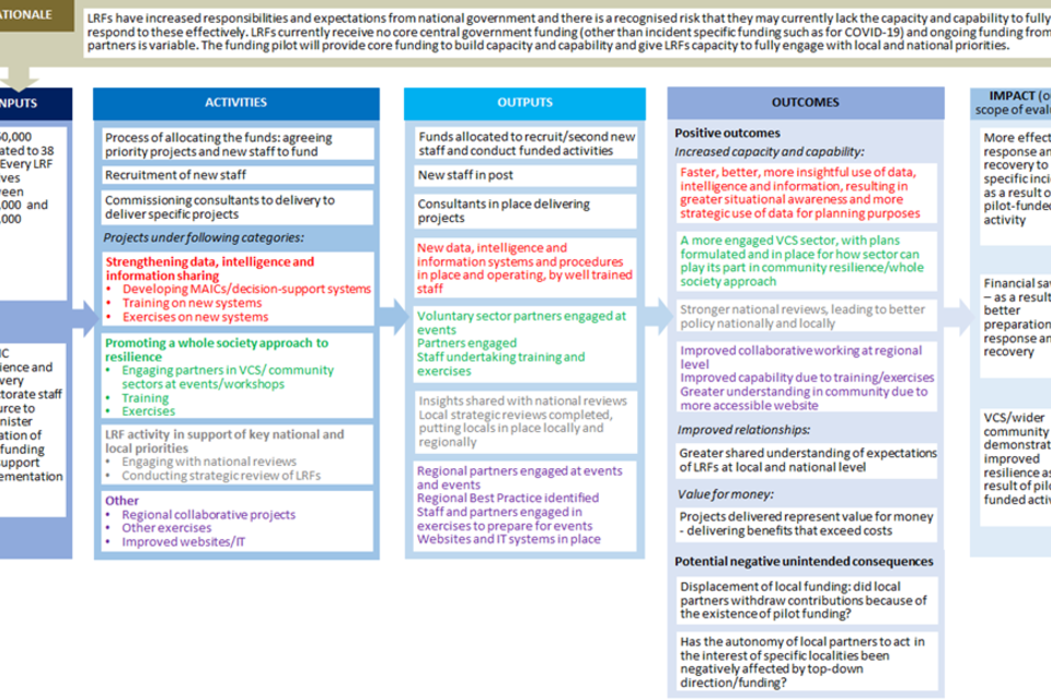 3. The aims of the evaluation were: to understand how, why and in what ways LRFs had used the pilot funding and to assess the outcomes, additionality, and value for money of this. The evaluation has drawn on the results of three surveys conducted by DLUHC of all LRFs and qualitative case study research with a purposive sample of 15 of the LRFs. It was recognised from the outset that quantitatively assessing the outcomes of the funding would not be feasible within the timeframe of evaluation. Instead, reflecting HMT Magenta Book good practice, a theory-based approach has been used to assess progress made towards outcomes in the longer term.
