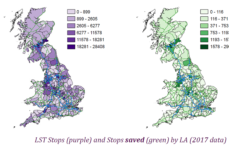 The results for Stops by LA are summarised in the heat maps shown below. These show both the numbers of journeys, and an estimate of the number of journeys saved compared to delivering the same total deck space of goods using 13.6m trailers. The maps highlight the operations in and out of the major logistics estates in the country (Midlands around Rugby, North West near Warrington, the Glasgow/Edinburgh corridor etc.) and delivery out to major centres of population.