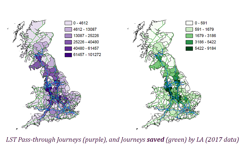 The trial data tells us the start and end of each journey, but not the route travelled. Routing information is not available for all the LSTs. At the start of the trial, tracking semi-trailers separately from the tractor units that pull them was not standard practice. During 2015 through to 2017 we therefore developed a method of modelling routes, using the start and end postcodes provided by operators for 2017. We validated the model route selection using a large sample of GPS data for a mix of LST and non-LST operations by trial participants (DfT judged it would be unreasonable to ask operators to fit GPS equipment as a condition of the trial, as it would limit participation to larger companies. While GPS use is now more common, our research suggests fewer than 50% of the trailers are fitted with GPS tracking).