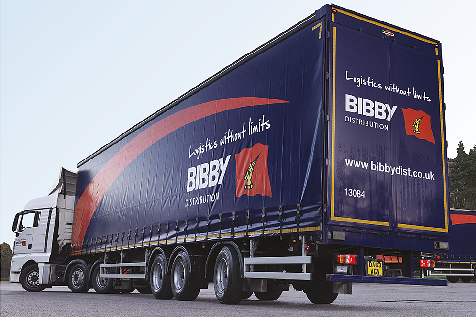 Tractor unit with longer semi-trailer in Bibby haulage livery