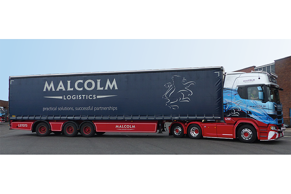 Tractor unit with longer semi-trailer in the livery of Malcolm logistics