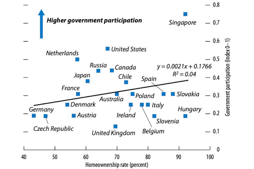 The IMF report also includes a diagram (Figure 2 below) indicating that higher rates of government participation in housing finance is associated with higher rates of home ownership, although note that the UK is rated as having a low government participation rate.