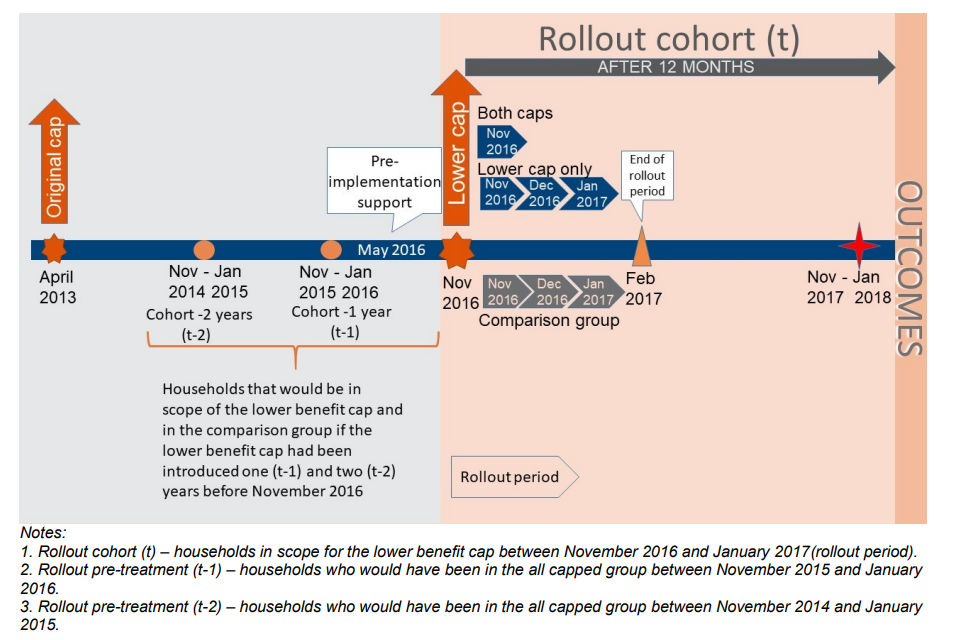 The dataset used in this analysis is extracted from DWP and Her Majesty’s Revenue and Customs (HMRC) administrative data for the period November 2016 to January 2018. The analysis tracks and compares outcomes of a) a group of households who were in scope for the cap (‘capped households’) when the lower cap began to roll out to b) a similar group of households but with total weekly benefit income just below the lower cap levels (‘comparison group’); the two groups are referred to as the ‘rollout cohort’.