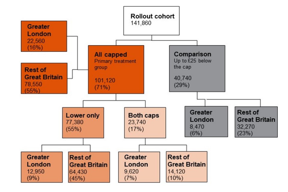 - comparison group: households whose total weekly benefit income is below the lower cap levels by £25 or less per week