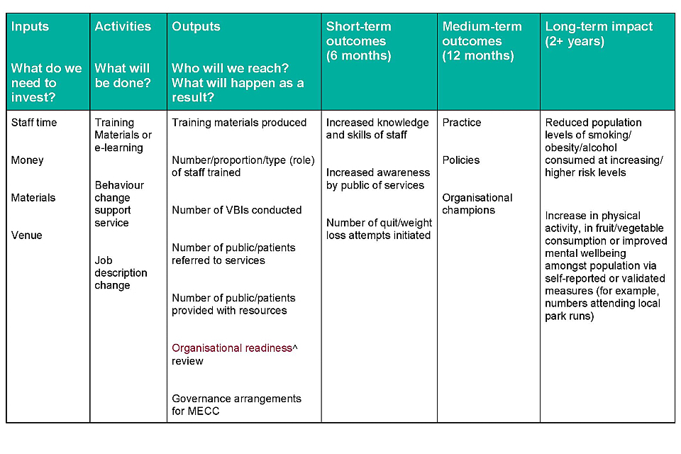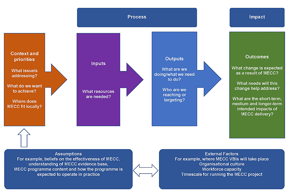 There is no consistent template for a logic model, as it will need to be developed following discussion and input from relevant leads for a programme. A simplified logic model for MECC might look like the one in Table 2 below. Further information on logic models can also be found in the resources section below.