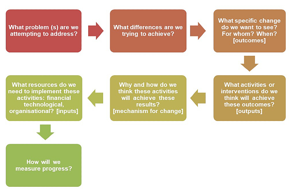 Using an approach known as ‘backcasting’ will help you to first identify the possible outcomes from your programme, arranging them from short term outcomes to those with longer term impact. Taking this approach will then help you to work backwards to identify the outputs and activities required to help your programme to achieve those outcomes.