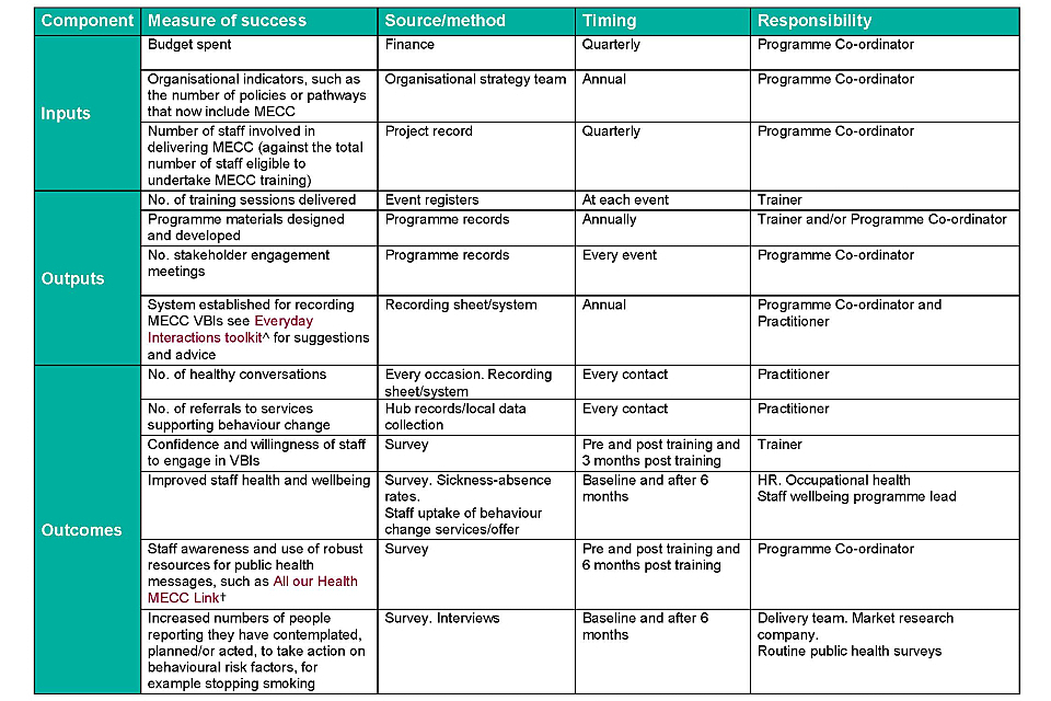 | Improvement in staff health and wellbeing | Impact on workforce wellbeing from the MECC approach to address behavioural risk factors ‡ | • development of staff wellbeing and health initiatives • staff uptake of services to support behaviour change • staff sickness absence rates • reported staff behavioural risk factor changes, such as stopping smoking, or starting an exercise activity or joining a wellbeing group |