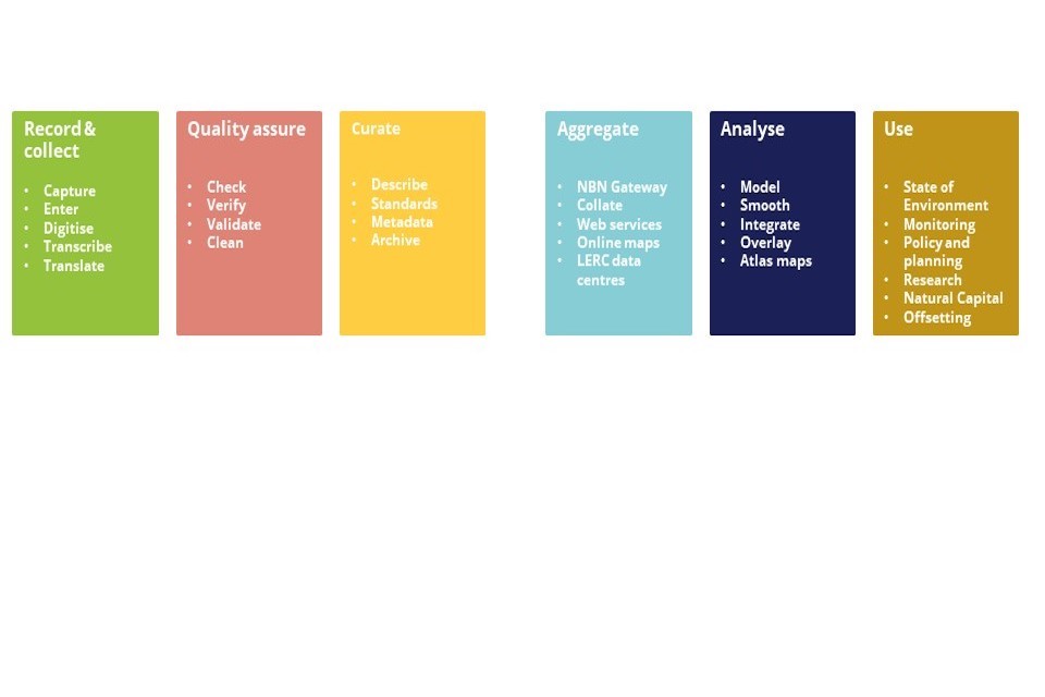 High quality, current and accessible species data are essential to underpin policy and land use planning towards sustainable outcomes for the environment and biodiversity. The species data landscape in England covers all types of marine, freshwater and terrestrial species. The National Biodiversity Network Data Flow Pathway (Figure S1) summarises the operations generally involved in creating, checking and sharing species data so that they can be put to use. Species data provided via this pathway are collected by numerous volunteers and professionals and then processed and stored across a wide range of organisations. Species data can be used for a wide range of purposes including developing and evaluating biodiversity and environmental policies, and decision making within local and national planning systems.