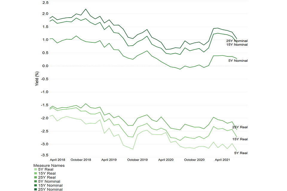 Both nominal and real yields fell over the month of July. The graph below shows how real yields have fallen to some of the lowest levels seen in recent years.