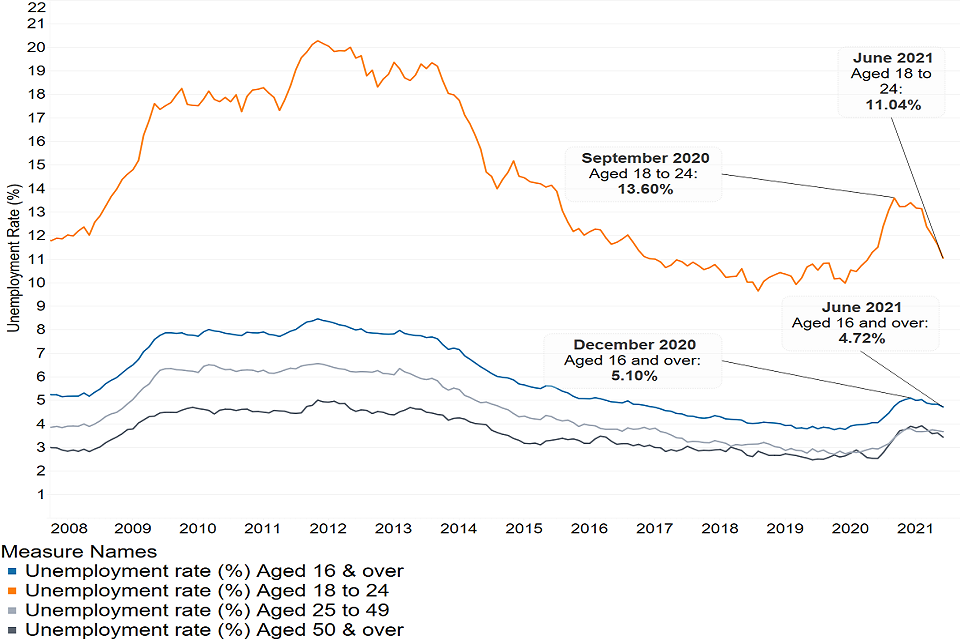 Unemployment rates for those aged 16 and above have shown a slight decrease in recent months. However, the most marked decrease in unemployment is in those aged 18-24. This could be attributed to hospitality and retail re-opening as social distancing measures were relaxed.