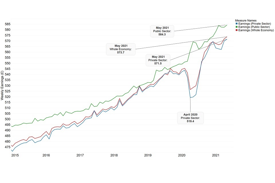 During the first quarter of 2021 earnings in the private sector, and in the economy as a whole, dipped slightly. This is likely to have been driven by the UK entering its third national lockdown at the end of 2020. However, May 2021 saw a modest increase in earnings of 0.8% across the whole economy. This increase has been driven by improvements in earnings in the private, rather than the public, sector.