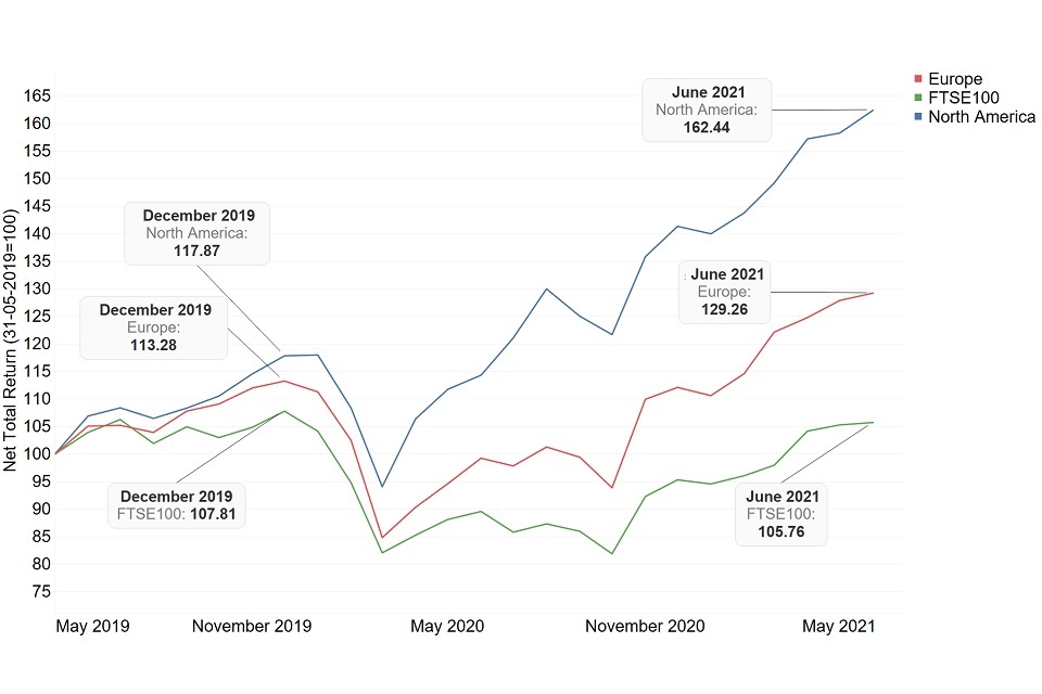 The graph also compares the FTSE 100 against the North American and European MSCI indices which measures stock market performances in those regions. The graph is based on a base index of 100 for all 3 indices as at 31 May 2019.