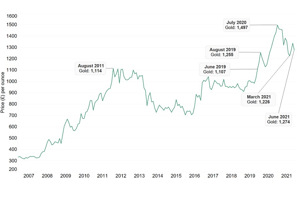 The following chart shows the price of gold in pounds sterling per ounce of gold over the past 15 years.