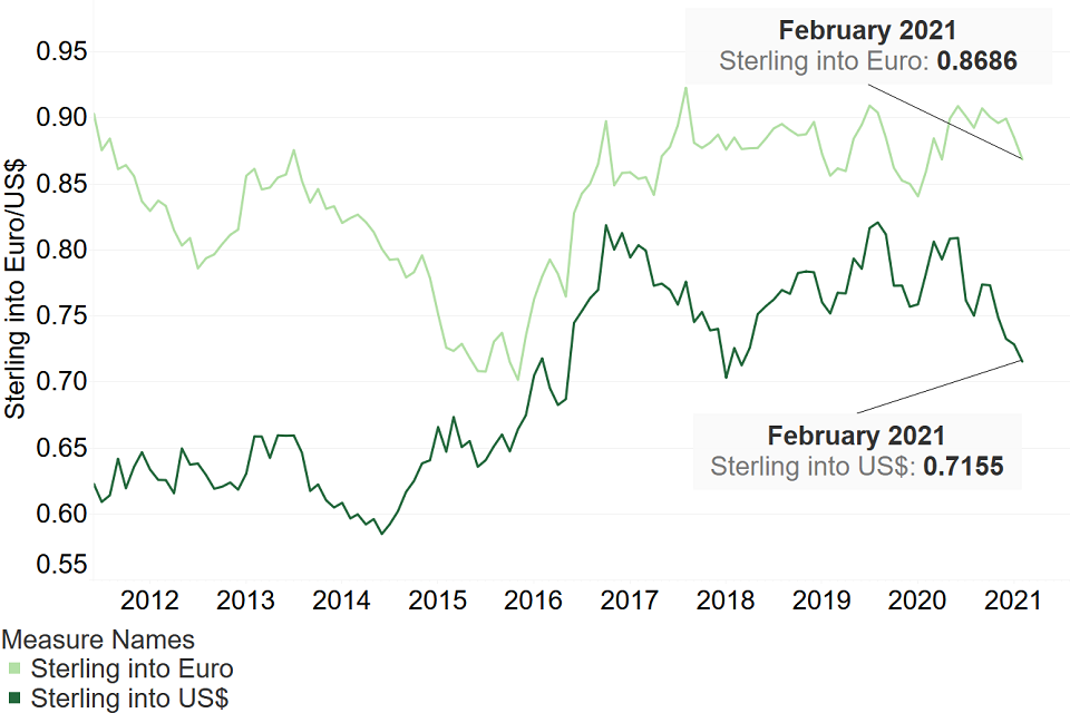 The US dollar rate as at February 2021 is 0.7155 British pounds, which is the lowest it has been since March 2018. The euro as at February 2021 is 0.8686 British pounds, which is the lowest it has been since April 2020.